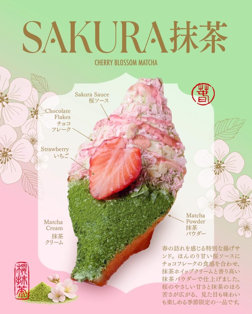 揚げサンド専門店のAge.3(アゲサン)では、2026年3月1日から春限定「SAKURA抹茶」を販売しています。なめらかな抹茶ホイップクリームに、桜ソースと桜&ホワイトチョコフレークをトッピングした春らしいメニューです。お花見のおともにぜひ試してみてください。